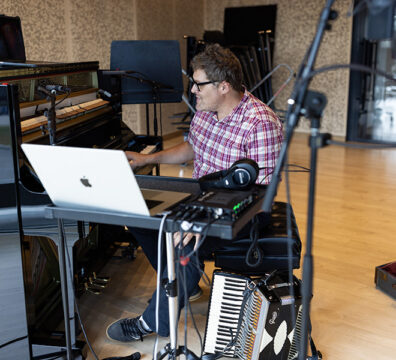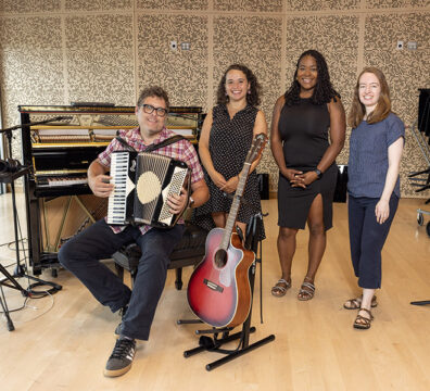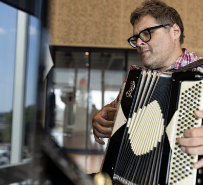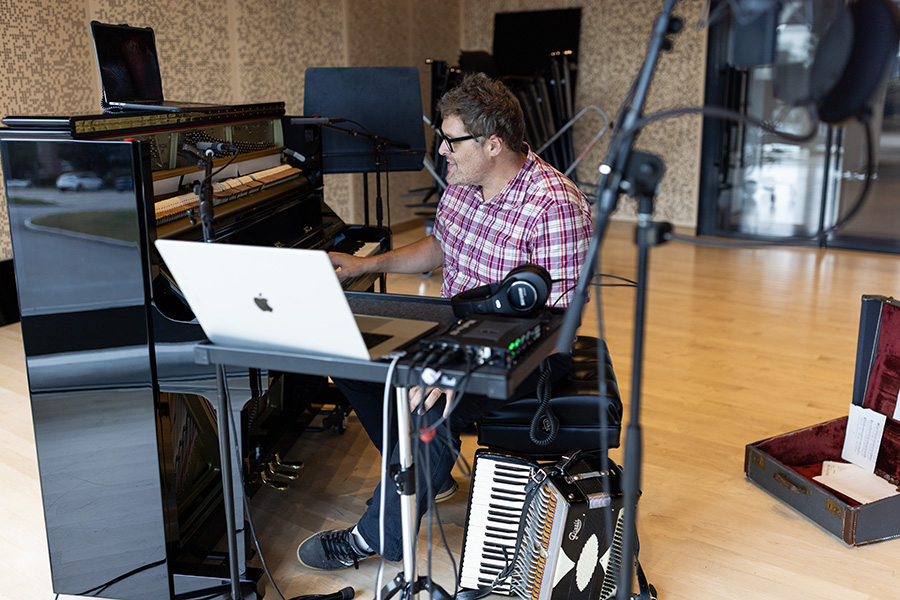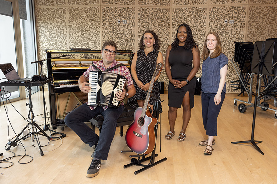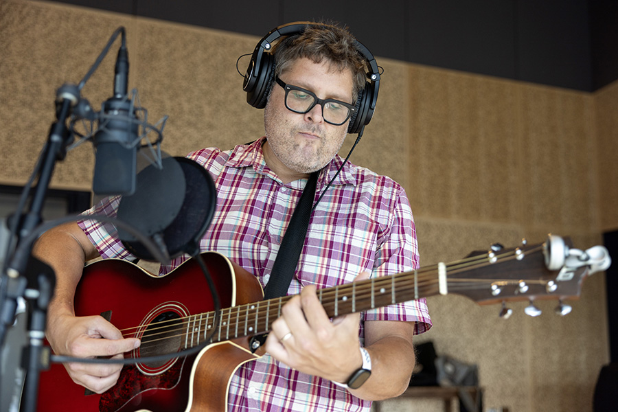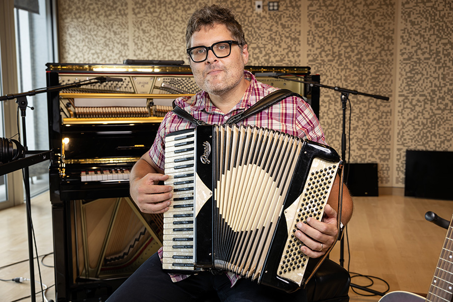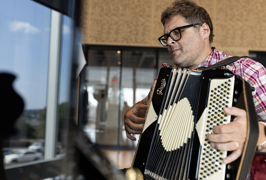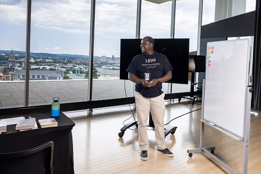 Local artist Daniel Gay photographed at the Prior Performing Arts Center on July 17, 2024. Gay is one of two participants in a new creative summer residency program as part of HC’s Scholarship in Action program, and in conjunction with the Worcester Cultural Commission’s three-year partnership between the College and the city. (Photo by Michael Ivins/Holy Cross)