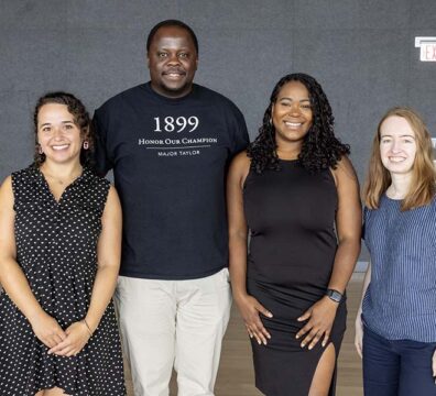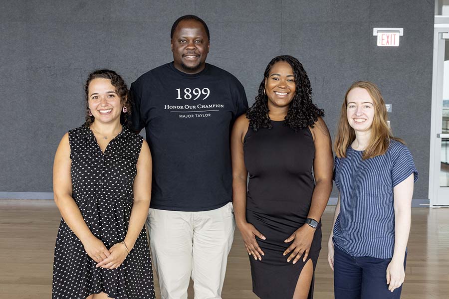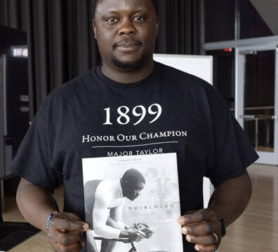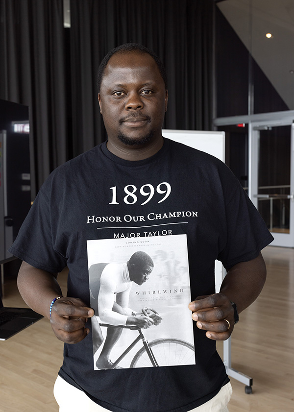Local documentary filmmaker Cyrille Vincent holds up a promotional poster for his film about Major Taylor at the Prior Performing Arts Center on July 17, 2024. Vincent is one of two participants in a new creative summer residency program as part of HC’s Scholarship in Action program, and in conjunction with the Worcester Cultural Commission’s three-year partnership between the College and the city. (Photo by Michael Ivins/Holy Cross)